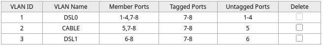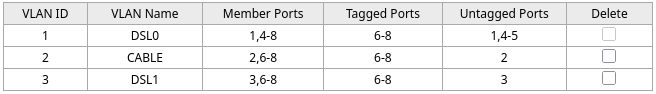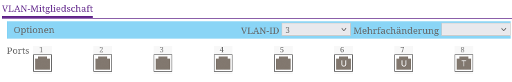 - Die Uplinks (dafür verwende ich die rechten/hohen Ports der Switche also Port 6-8) sind alle Tagged und transportieren alle 3 Netze